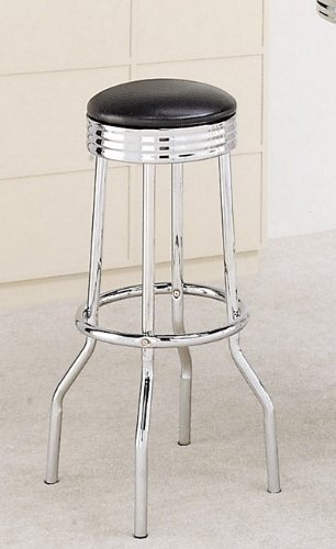 This is a great pair of little retro swivel bar stools, perfect for apartments or other small spaces. This is a brand new in box 50's Retro Nostalgic Style Set of 2 Fountain Bar Stool/Stools with Chrome Plating and Black Vinyl Covered Cushioned Seat 29"H. This item is modeled after the famous style of the American 1950's Diner that has served so many back in the days. The tubular steel frame of the item is plated with chrome and constructed with quality. Its smooth, strong, and durable surfaces makes it easy to clean and hassle free. This item is sold in sets of 2 only, for safety in packaging and shipping.(Requires Simple Assembly)**Dimensions Measure:*14 1/4"L x 14 1/4"W x 29"H