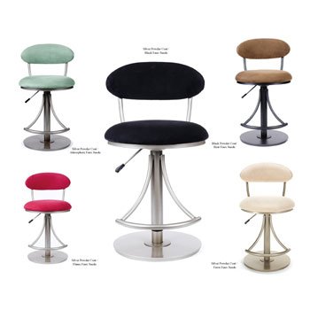 Give your decor a lift with these retro-styled adjustable stools, designed to accommodate just about everyone with their easy up-and-down action. Just press the lever to raise the seat from 24" counter height to 30" bar height, or any position in between. The Venus adjustable bar stools are also great for children who need to sit higher, or tall friends who want to sit a little lower. Each stool also swivels 360 degrees, and has a comfortably curved foot rail. These contemporary swivel bar stools are constructed of powdercoated metal/steel with plush, faux suede seats of 100% polyester. Choose Black metal with Brown faux suede, or Silver-tone metal with Black, Flame, Green, or Beige faux suede, as available below.Stool with Seat Back 19-1/4"W x 20-1/5"D x 34"-40"H. Backless Stool 19-1/4"W x 20-1/2"D x 24"-30"H. Specify: Black/Brown, Black, Flame, Green, or Beige (Backless Stool is no longer available in green.)Please allow up to 3 weeks for delivery.