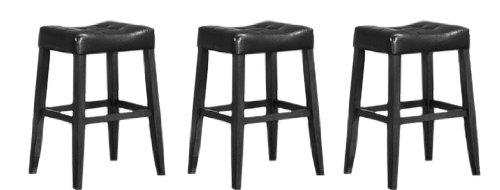 These are 3 new Saddle Back barstools! They have a black seat and are 29" tall. The legs on the stools are solid wood and are in a black finish and it also includes a place to rest your feet. The cushion is black and has a similar feel to leather. It is 3 1/2 " thick.