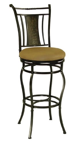 Lavish style and cutting-edge design combine to form the "Paxton" stool by Ashley Blaire. Built from a durable, tubular metal and saturated in a rich, black with brushed bronze finish. The distressed, inset seat back design is trimmed out with a chic twisted metal theme that creates a nostalgic ambiance. "Paxton" also features a 360° swivel, built in levelers in the feet, and a patent pending 24" & 30" adjustable leg distinguish this stool from all others with out compromising the stability of the stool. A generously cushioned, beige microfiber upholstered seat cushion provides top notch relaxation and ease of mind with its sturdy, easily cleaned material. Create a warm, inviting, and stylish seating area in your home with the assistance of Ashley Blaire's "Paxton" adjustable extension stool.