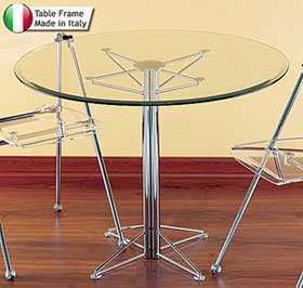 Host your next party with this contemporary table. A sturdy crossbar base with suction cups that secure the glass top to the frame, supports a round tempered glass tabletop. With simple angles, it creates a clean, modern motif. Matches perfectly with our Acrylic Telescoping Chairs (sold separately). Table frame Made in Italy.