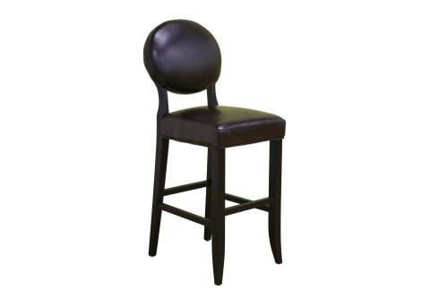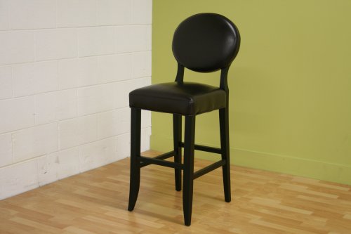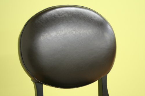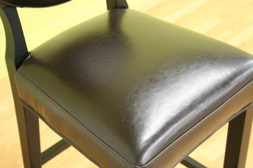 A leather bar stool with a classic design, this chair features deep espresso brown bycast leather upholstering all seating areas and includes light padding underneath for comfort. The frame and legs are wood, which have been stained black. The result of adding this traditional kitchen counter bar stool to your home or business is an instant increase in sophistication and, of course, functional seating options.