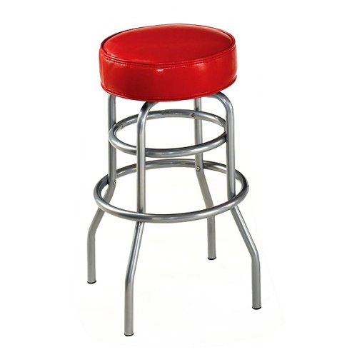 Home Styles Soda Shoppe collection swivel bar stool has a rugged powder coated steel frame for durability.Bar stool features classic retro styling, with a red vinyl swivel seat and a silver finish frame with dual footrest rings.Ships ready to assemble.