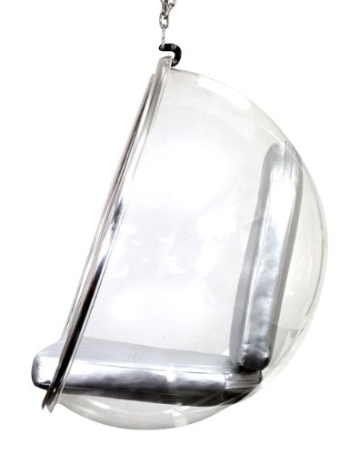 Based on the idea of the Ball Chair the Bubble Chair is a reduction of this design. As Ludwig Mies van der Rohe said: Less is more! A masterpiece of reduction.Aarnio about Bubble Chair: "After I had made the Ball Chair I wanted to have the light inside it and so I had the idea of a transparent ball where light comes from all directions. The only suitable material is acrylic which is heated and blown into shape like a soap bubble. Since I knew that the dome-shaped skylights are made in this way I contacted the manufacturer and asked if it would be technically possible to blow a bubble that is bigger than a hemisphere. The answer was yes. I had a steel ring made, the bubble was blown and cushions were added and the chair was ready. And again the name was obvious: BUBBLE." 'There is no nice way to make a clear pedestal' Eero Aarnio notes. That is the lucky reason why the Bubble Chair hangs from the ceiling. Like the Ball Chair the Bubble Chair also impresses the user by the special accoustic. The Bubble Chair swallows the sounds and you feel isolated inside in a pleasant way, even when you are in a crowded place. At the EXPO 2000 in Hannover eleven Bubble Chairs were installed in the Cycle Bowl "Blue Box" of the GrĂ¼ne Punkt Deutschland Pavillion as small, individual information spaces whithin the library. The Norwegean phonecompany Telenor has installed some Bubble Chairs in the entrance hall of their new building in Oslo to offer calm "rooms" for mobile phoning. The transparent chair is used in music videos, advertising and fashion magazines. Celebreties like Darryl Hannah, Donnatella Versace and Nina Hagen have enjoyed the Bubble Chair on foto shootings and Carmen Electra on cover of the December 2000 issue of Playboy.