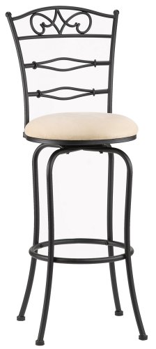 The elegance of the Aurora stool is brought forth by its intricate scrollwork. Notice the curling scrolls in the back support. A black matte finish and swiveling faux suede seat add convenience and beauty to the Aurora counter barstool. Perfect for kitchen counter or bar counter seating. Black matte finish. Counter stool height seat. Beige faux suede seat. Design by Hillsdale. 38 1/2" high. Seat height is 24". 17" wide. 17 1/2" deep.
