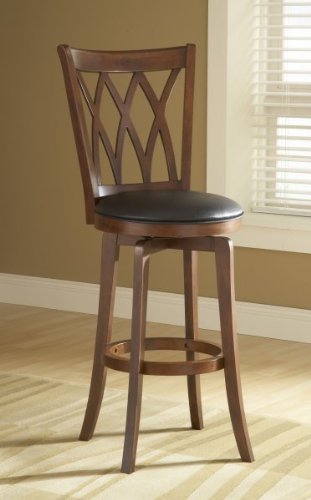 Featuring a brown cherry finish, our Hillsdale barstools add character to a room. The criss-cross pattern has simple appeal that is at home in any setting. The black faux leather seat fits beautifully with the rich brown cherry finish and swivels 360 degrees. Great for kitchen counter or bar use. Design by Hillsdale. Brown cherry finish. Black faux leather seat. Armless design. Swiveling seat. Bar height seat. 46 3/4" high. 18 1/4" wide. 21 1/2" deep. 30" seat height.