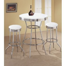 Great new bistro bar stool set with glittery seats. The seats are 29" tall, white glitter vinyl and come in the retro chrome look. They're strong, new and well built. This table stands 42" tall and 30" across. This table comes in white. This set is made in the traditional soda fountain style. We have a set with four bar stools in another listing!