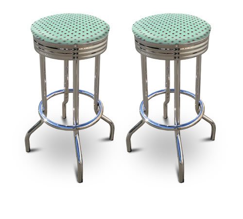 These are new 29'' chrome barstools that have footrests and a swivel seat. The seats feature Brown Dots on Turquoise upholstery. The sides of the seat have nice metal work and there are feet protectors on the bottom of each leg. These are great for kitchen or shop, or spread around a game room or patio setting. In this listing you will receive 2 chrome bar stools!
