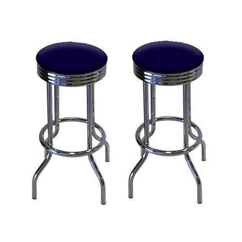 Perfect for any Man-Cave environment. These are new 29'' chrome barstools that have footrests and a swivel seat. The seats feature Blue Velvet upholstery. The sides of the seat have nice metal work and there are feet protectors on the bottom of each leg. These are great for kitchen or shop, or spread around a game room or patio setting. In this listing you will receive 2 MAN CAVEchrome bar stools!
