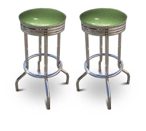 Perfect for any Man-Cave environment. These are new 29'' chrome barstools that have footrests and a swivel seat. The seats feature Emerald Glitter Vinyl upholstery. The sides of the seat have nice metal work and there are feet protectors on the bottom of each leg. These are great for kitchen or shop, or spread around a game room or patio setting. In this listing you will receive 2 MAN CAVEchrome bar stools!