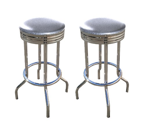 Perfect for any Man-Cave environment. These are new 29'' chrome barstools that have footrests and a swivel seat. The seats feature Silver Glitter Vinyl upholstery. The sides of the seat have nice metal work and there are feet protectors on the bottom of each leg. These are great for kitchen or shop, or spread around a game room or patio setting. In this listing you will receive 2 MAN CAVEchrome bar stools!